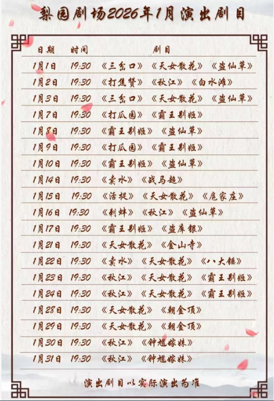 梨园剧场2026年1月演出剧目 口 日期 时间 剧目 1月1日 19:30 《三岔口》《天女散花》《盗仙草》 1月2日 19:30 《打焦赞》《秋江》《白水滩》 1月3日 19:30 《三岔口》《天女散花》《盗仙草》 1月7日 19:30 《打瓜园》《霸王别姬》 1月8日 19:30 < 《霸王姬》《盗仙草》 1月9日 19:30 《打瓜园》《霸王别姬》 1月10日 19:30 《霸王别姬》《盗仙草》 1月14日 19:30 《卖水》《战马超》 1月15日 19:30 《活捉》《天女散花》《扈家庄》 1月16日 19:30 《刺蚌》《秋江》《盗仙草》 1月17日 19:30 《霸王别姬》《盗库银》 1月21日 19:30 《天女散花》《金山寺》 1月22日19:30 《卖水》《天女散花》《八。大锤》 1月23日19:30 《秋江》《天女散花》《霸王别姬》 1月24日19:30 < 《秋江》《天女散花》《霸王别姬》 1月28日 19:30 《天女散花》《朝金顶》 1月29日 19:30 《天女散花》《朝金顶》 1月30日 19:30 《秋江》《钟馗嫁妹》 1月31日 19:30 《秋江》 《钟馗嫁妹》 演出剧目以实际演出为准